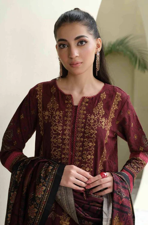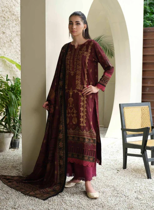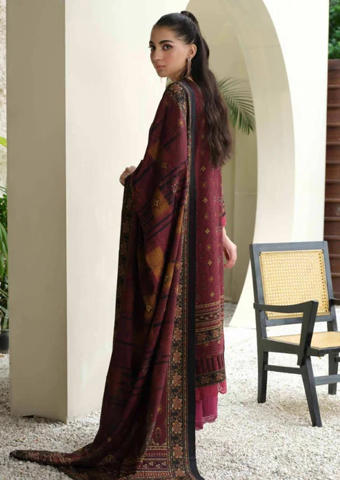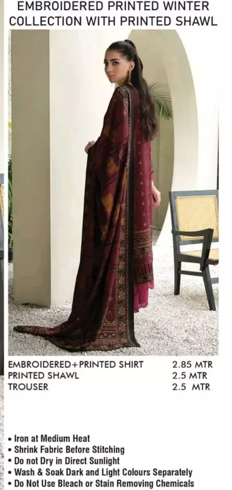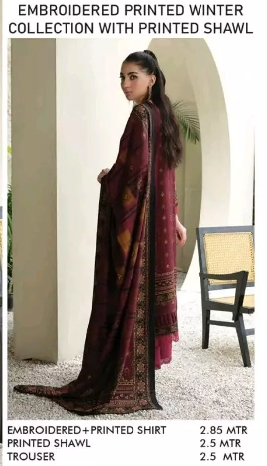 Explore the 2024 Winter Collection with “Anmol by Johra JH-185” in Cocoa Bean. This 3-piece unstitched set offers a striking combination of embroidered and printed Dhanak fabric on the shirt, creating a warm and chic aesthetic. Complemented by a beautifully printed shawl, it provides both style and comfort for winter wear. The plain trouser balances the outfit, making it versatile for casual and semi-formal occasions. This sophisticated ensemble is the perfect addition to your winter wardrobe.