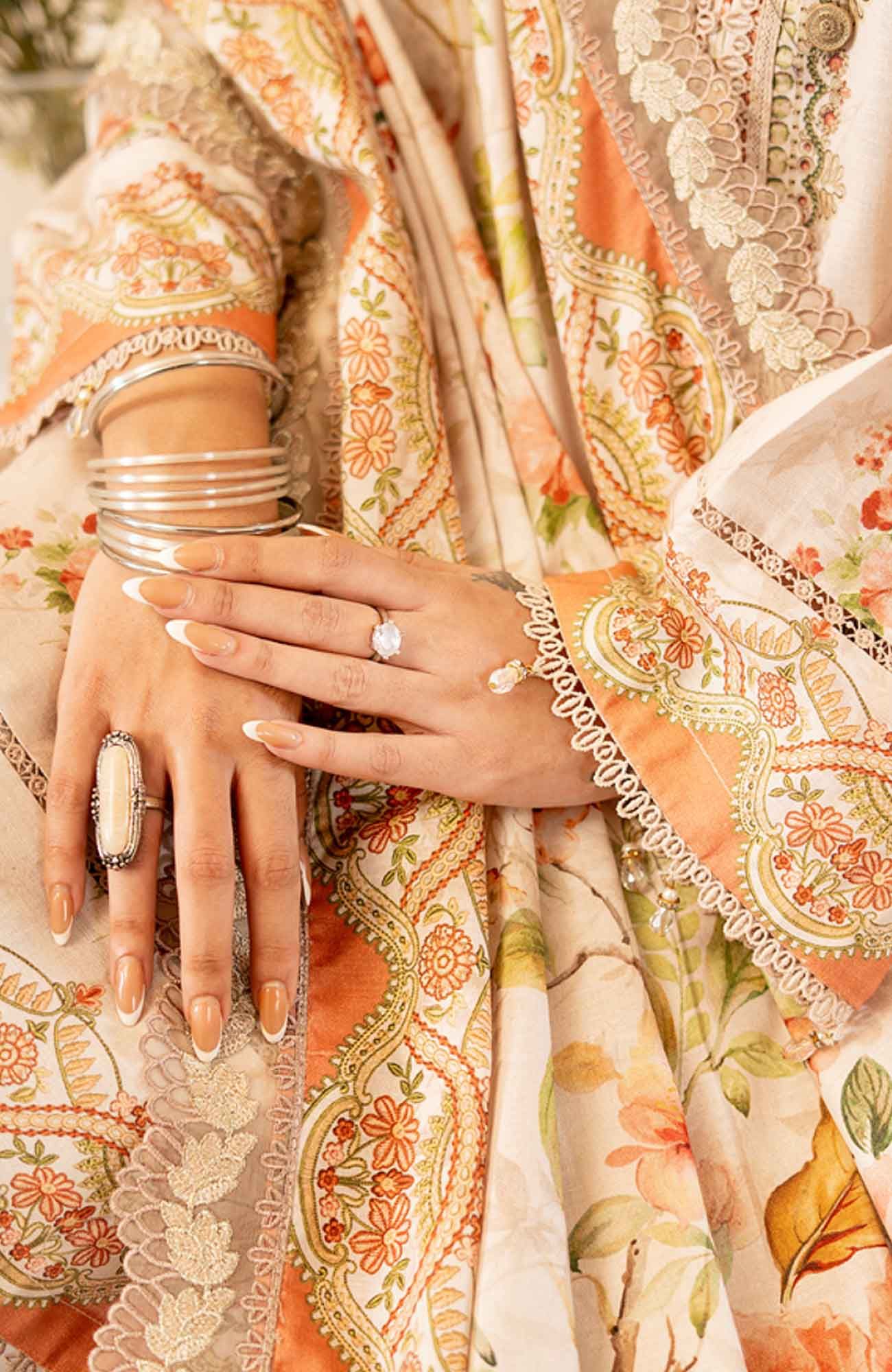 Piping, lace, buttons, embellishments, tassels, necklace, shoes and other accessories. these are only used on models by the brands to enhance the look of the finished product.