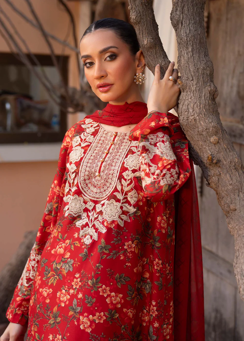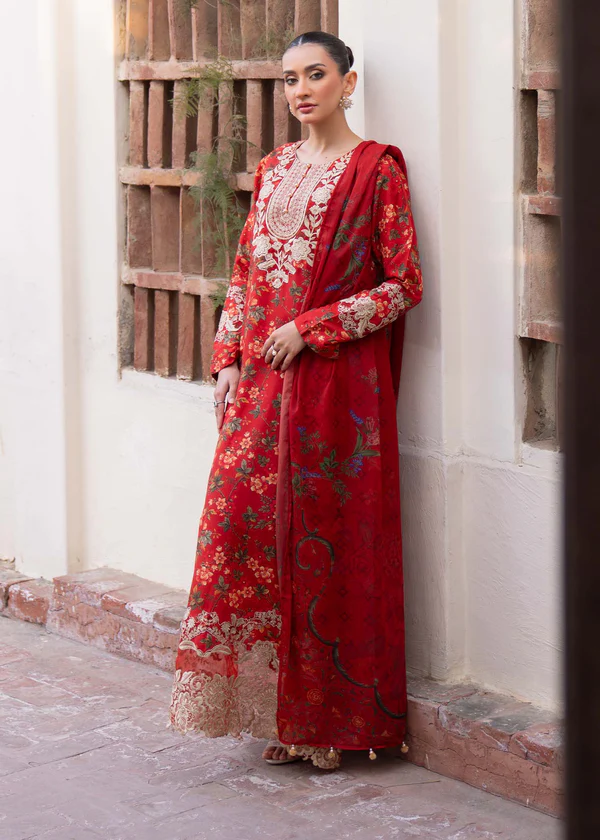 The Aatish outfit features a printed lawn shirt adorned with an embroidered neckline patch, embroidered sleeves patch on organza, and a beautifully embroidered border, adding a touch of elegance to its design. Paired with a plain dyed cambric trouser, this ensemble is completed with a printed chiffon dupatta that adds a soft and graceful flow to the overall look.