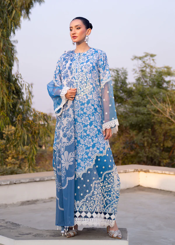 The Zarposh outfit features a printed lawn shirt, elegantly designed with an embroidered neckline patch, embroidered sleeves patch on organza, and an embroidered border patch on organza, adding intricate detailing and charm. The shirt is paired with a plain dyed cambric trouser . Completing the look is a printed chiffon dupatta that flows gracefully, enhancing the overall design with its soft texture.